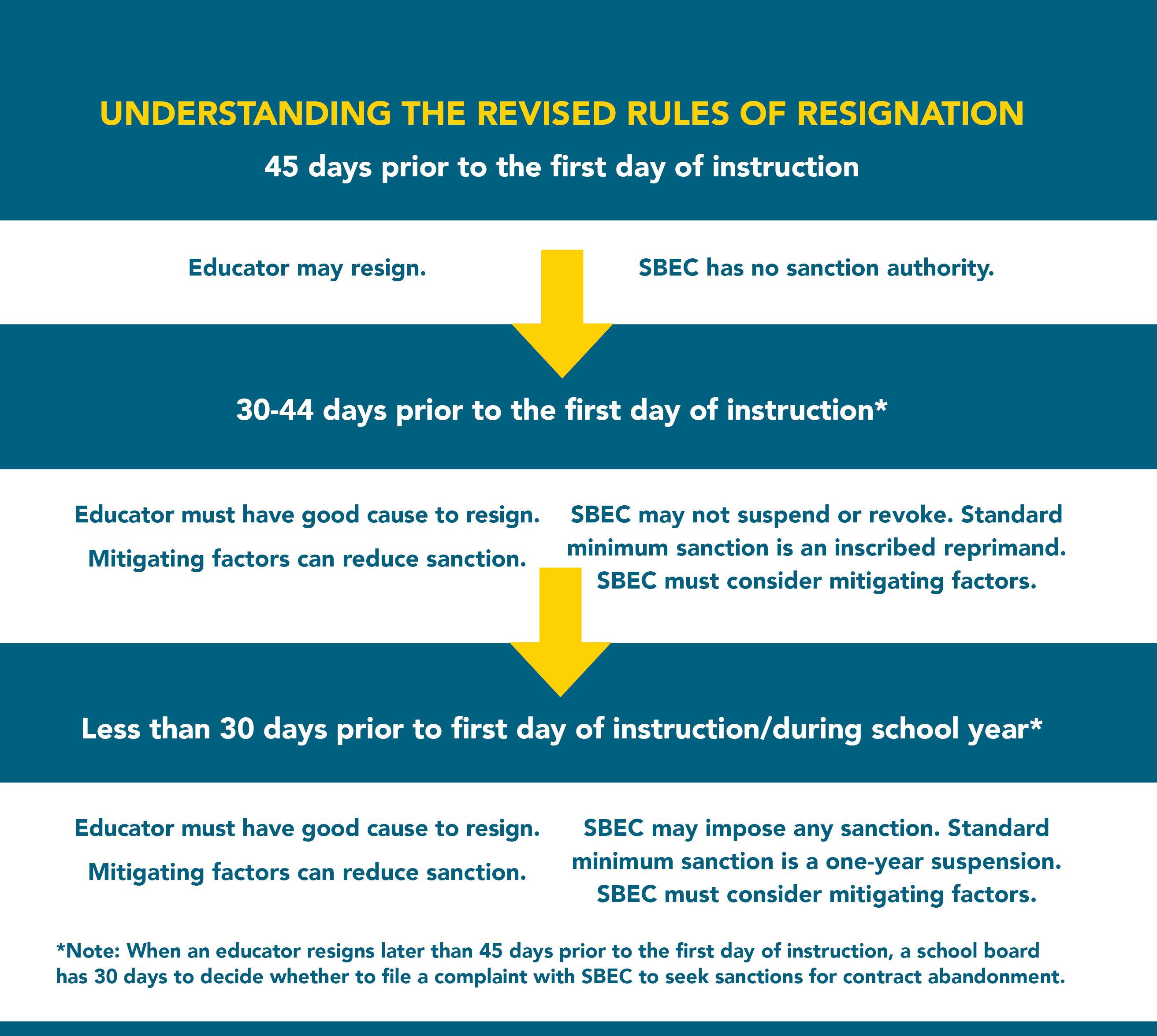 As always, an educator who resigns 45 days prior to the first day of instruction is not subject to sanctions. However, an educator who resigns 44 to 30 days prior to the first day of instruction may be subject to a mandatory minimum sanction of an inscribed reprimand if no mitigating factors apply. An educator who resigns fewer than 30 days before the first day of instruction or at any point during the school year may be subject to at least a one-year suspension if no mitigating factors apply. In any case in which SBEC determines an educator has good cause for contract abandonment, the educator would not be subject to sanction by SBEC regardless of when the educator resigned.